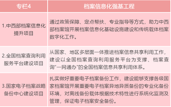 ——档案信息化建设再上新台阶。档案信息化发展保障机制进一步完善,档案信息化建设进一步融入数字中国建设,新一代信息技术在档案工作中的应用更为广泛,信息化与档案事业各项工作深度融合,档案管理数字化、智能化水平得到提升,档案工作基本实现数字转型。