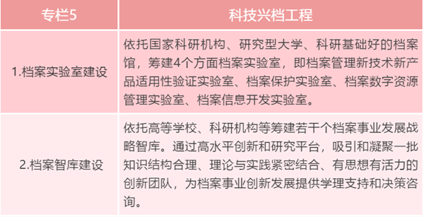 21.加大重点科研任务攻关力度。坚持创新和实用科研方向,进一步整合和强化科技力量,加快建设重点档案实验室,集中力量打好制约档案事业发展的理论创新和技术攻坚战。着力开展新时代档案治理相关理论及政策研究。重点开展新一代信息技术在档案管理中的应用、大数据环境中电子文件与电子档案一体化管理、电子档案长期安全保存、档案信息资源共享利用、自主可控环境下档案数字资源管理、档案数据治理、超低能耗档案馆建设、传统载体档案保护和修复等重大课题研究。加大在电子档案凭证价值保障、结构化数据归档、档案内容信息深度开发、纸质档案去酸技术及其效果评估等技术方面的攻关力度,力争实现突破。