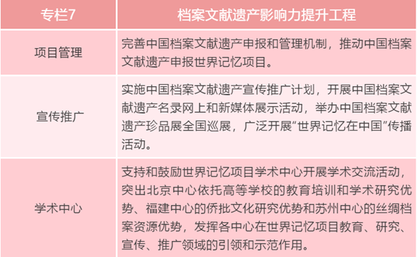 26.积极参与联合国教科文组织世界记忆项目。加强与联合国教科文组织世界记忆项目秘书处和国际咨询委员会合作,积极参与世界记忆项目亚太地区委员会各项活动。加强统筹谋划,促进入选文献研究和宣传推广。促进世界记忆项目与联合国教科文组织其他遗产项目协同发展。发挥世界记忆项目北京、福建和苏州等学术中心作用。实施档案文献遗产影响力提升工程。