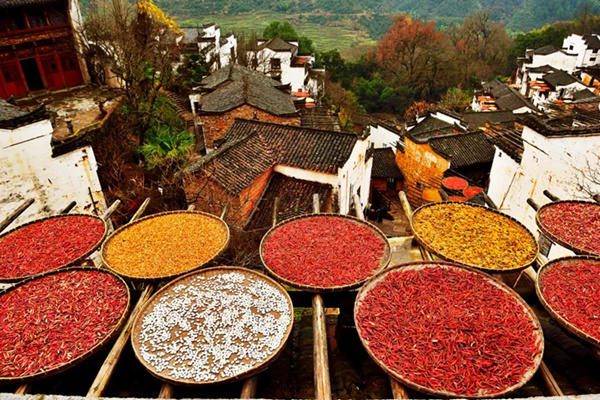 重阳节是最好的赏秋时期,中国南方还有些山区村落保留了“晒秋”特色。去乡村赏民俗、看晒秋,已成为乡村旅游的一种时尚。“晒秋”是一种典型的农俗现象,具有极强的地域特色。在湖南、广西、安徽、江西等生活在山区的村民,由于地势复杂,村庄平地极少,只好利用房前屋后及自家窗台屋顶架晒、挂晒农作物,久而久之就演变成一种传统农俗现象。这种村民晾晒农作物的特殊生活方式和场景,逐步成了画家、摄影家追逐创造的素材,并塑造出诗意般的“晒秋”称呼。