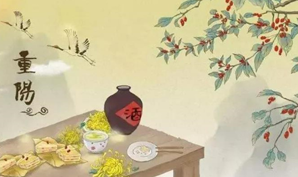 重阳节的求寿之俗,现存文字记载最早见于汉代文学作品。汉代《西京杂记》中记载:“九月九日,佩茱萸,食蓬饵,饮菊花酒,云令人长寿。”《荆楚岁时记》云:“九月九日,四民并籍野饮宴。”隋杜公瞻注云:“九月九日宴会,未知起于何代,然自驻至宋未改。”在祭天祭祖的基础上加入了求长寿及饮宴,构成了重阳节的基础。重阳时节的大型饮宴活动,其实是由先秦时庆丰收祭祀宴饮发展而来。发展至今,摆敬老宴、饮宴祈寿风俗仍在一些地方流行。